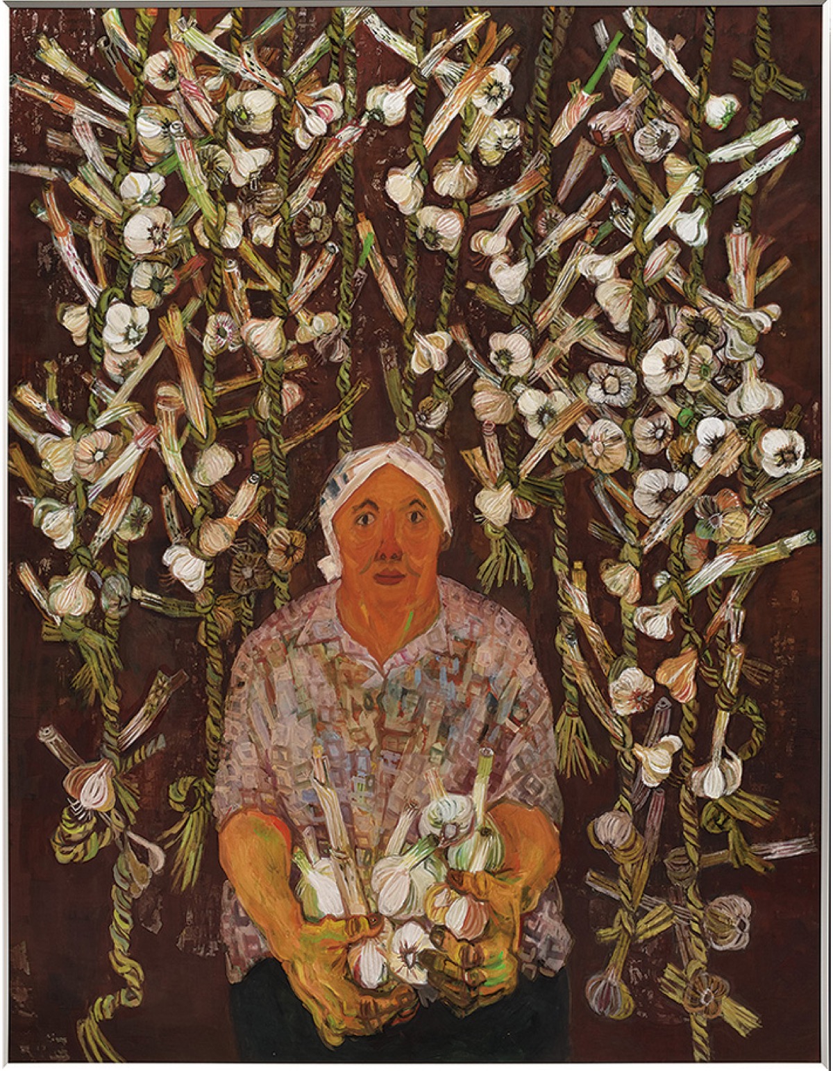 千葉さんが描いた作品は『暮らし』。収穫後のニンニクを乾燥させる様子が力強く描かれている。「ニンニクの生命力を表現できれば」と語り、初の最優秀賞受賞を喜んだ。