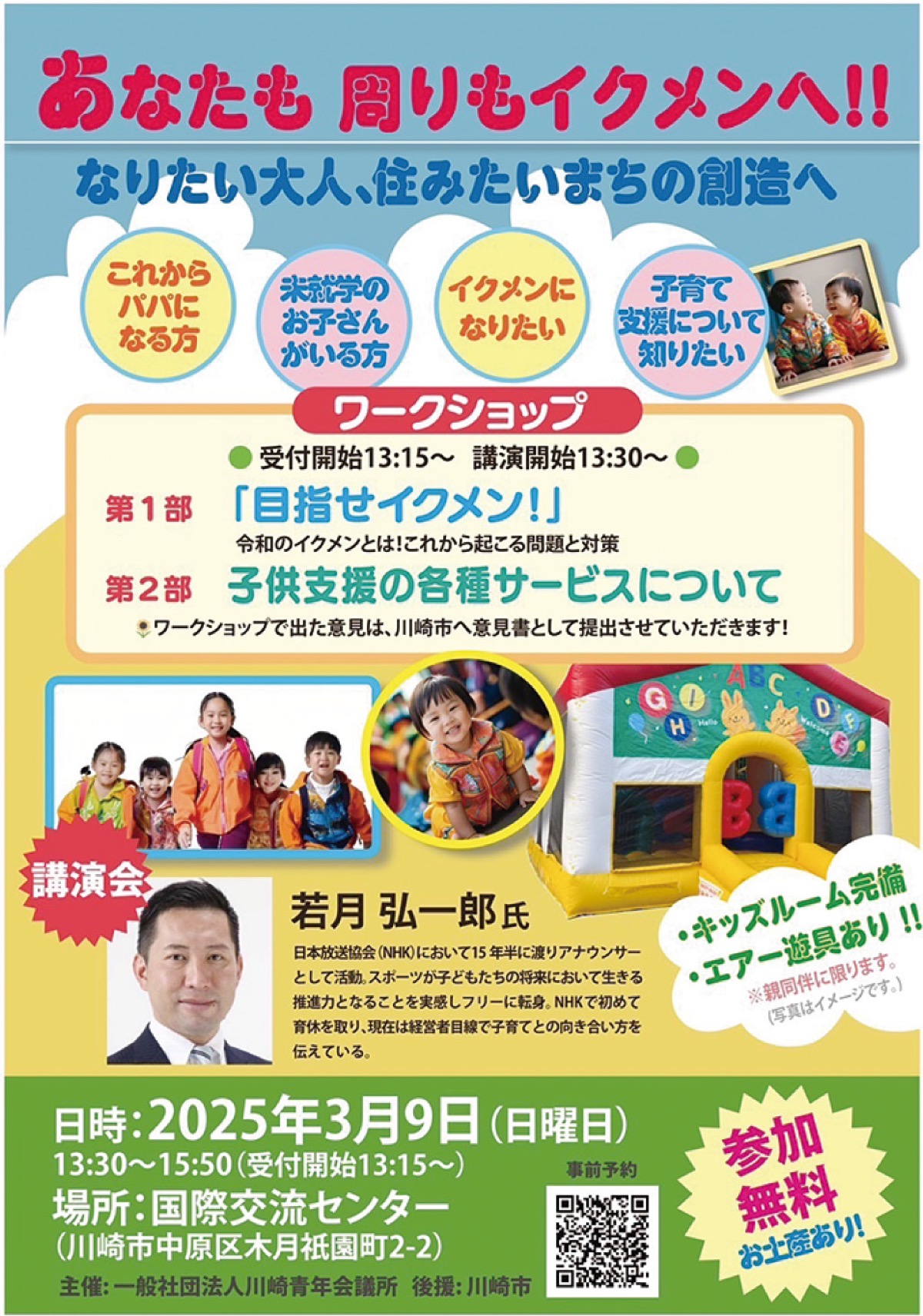 一般社団法人川崎青年会議所(JC/木村正理事長)は3月9日(日)、「あなたも周りもイクメンへ〜なりたい大人、住みたいまちの創造へ〜」を国際交流センター(中原区)で開催する。