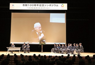 川崎市立高校5校(川崎、幸、川崎総合科学、橘、高津)の生徒とノーベル化学賞を受賞した旭化成名誉フェローの吉野彰さんが意見交換を行った「市制100周年記念シンポジウム〜川崎臨海部の未来を考える〜」がこのほど、カルッツかわさき(川崎区富士見)で開催された。