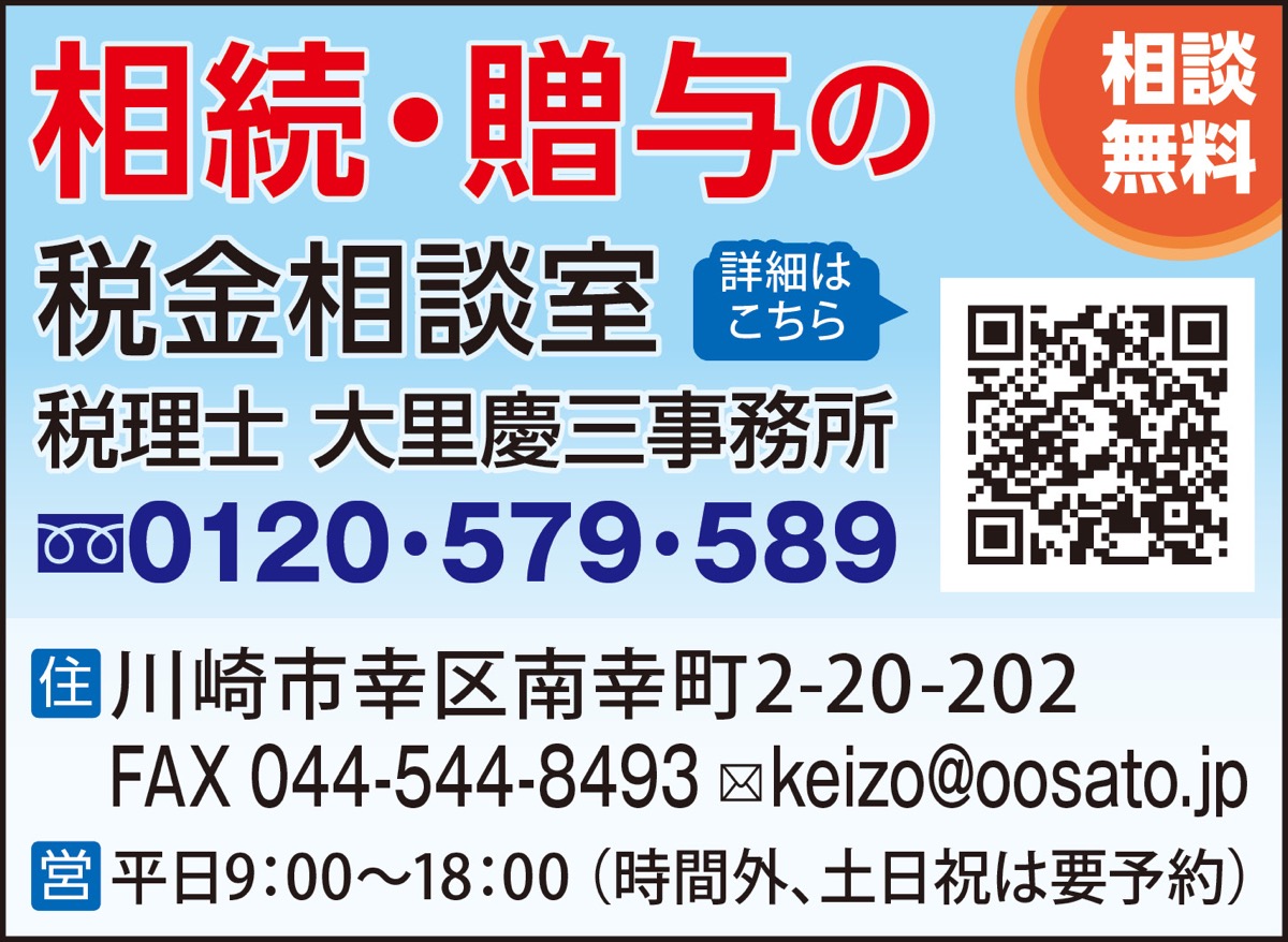 JR川崎駅西口より徒歩8分にある「税理士 大里慶三事務所」では、相続・贈与に関する初回相談を無料で実施している(予約制、1回30分)。