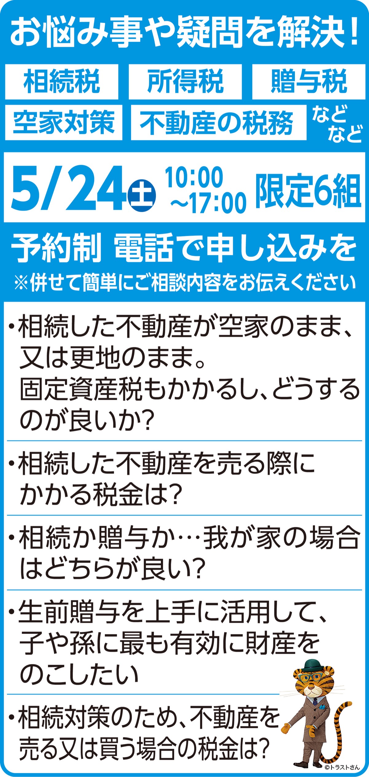 「我が家に相続税はかかるのか」「不動産の売却や住み替えにまつわる税金や特例について知りたい」「相続した不動産はどうすればいいか」など1組60分、我が家の場合での相談が可能。限定6組で予約制(先着順受付)。「毎回ご好評をいただいておりますので、ご予約はお早目にお電話下さい」と担当者。予約・問合せは下記へ。