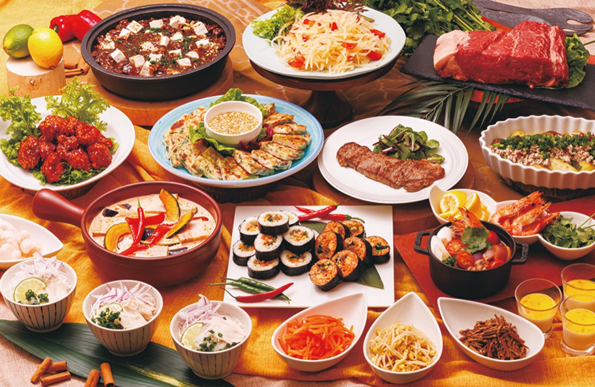 魅力はシェフが目の前でライブパフォーマンスを行い、豪快に焼き上げる鉄板焼ステーキ。ほかにもタイや韓国など、アジア各国のバラエティー豊かな料理が楽しめる。