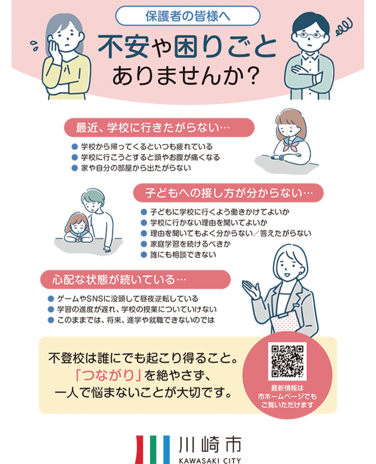不登校支援のための保護者向けパンフレットが作成されました。これまで分散していた不登校に関する相談窓口や、居場所・多様な学びの場に関する情報が、一冊にまとめられています。保護者からは「情報が一つにまとまって分かりやすい」との声が私の元にも届いております。