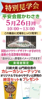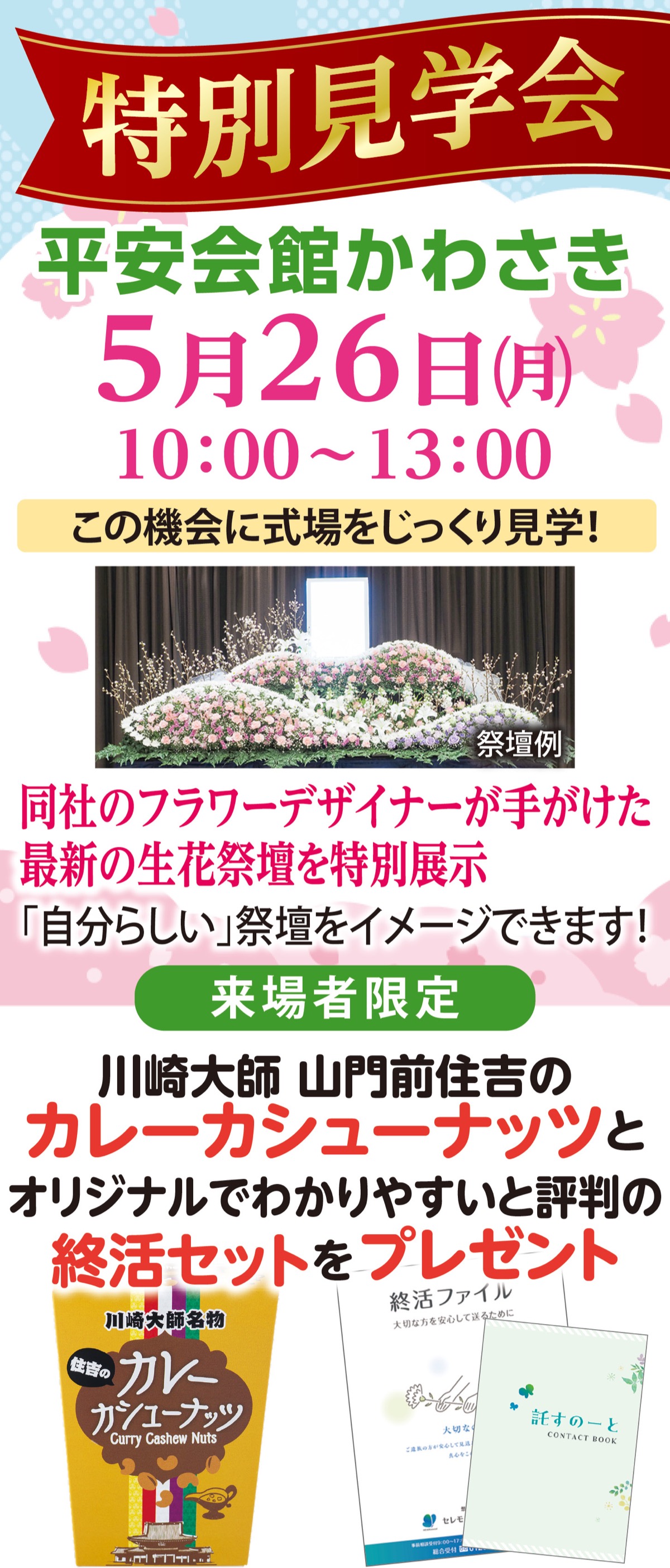 地域に寄り添い「安心」と「信頼」を届けるセレモニアグループの『平安会館かわさき』は5月26日(月)、特別見学会を開催する。午前10時から午後1時。予約不要。