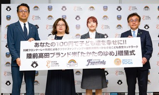 4月20日にUとどろきスタジアムで行われた記者会見には、佐藤理事長、陸前高田市の佐々木拓市長、フロンターレの吉田明宏社長も同席。佐々木市長は「素晴らしい企画に参加でき、感謝している」と話し、吉田社長は「自ら行動を起こし、広い視点を持った情熱に感銘を受けた。今後の活躍に期待したい」と斎藤さんへエールを送った。佐藤理事長は「こども食堂は運用資金の調達に苦慮している。斎藤さんの思い、行動に感謝している」と話した。