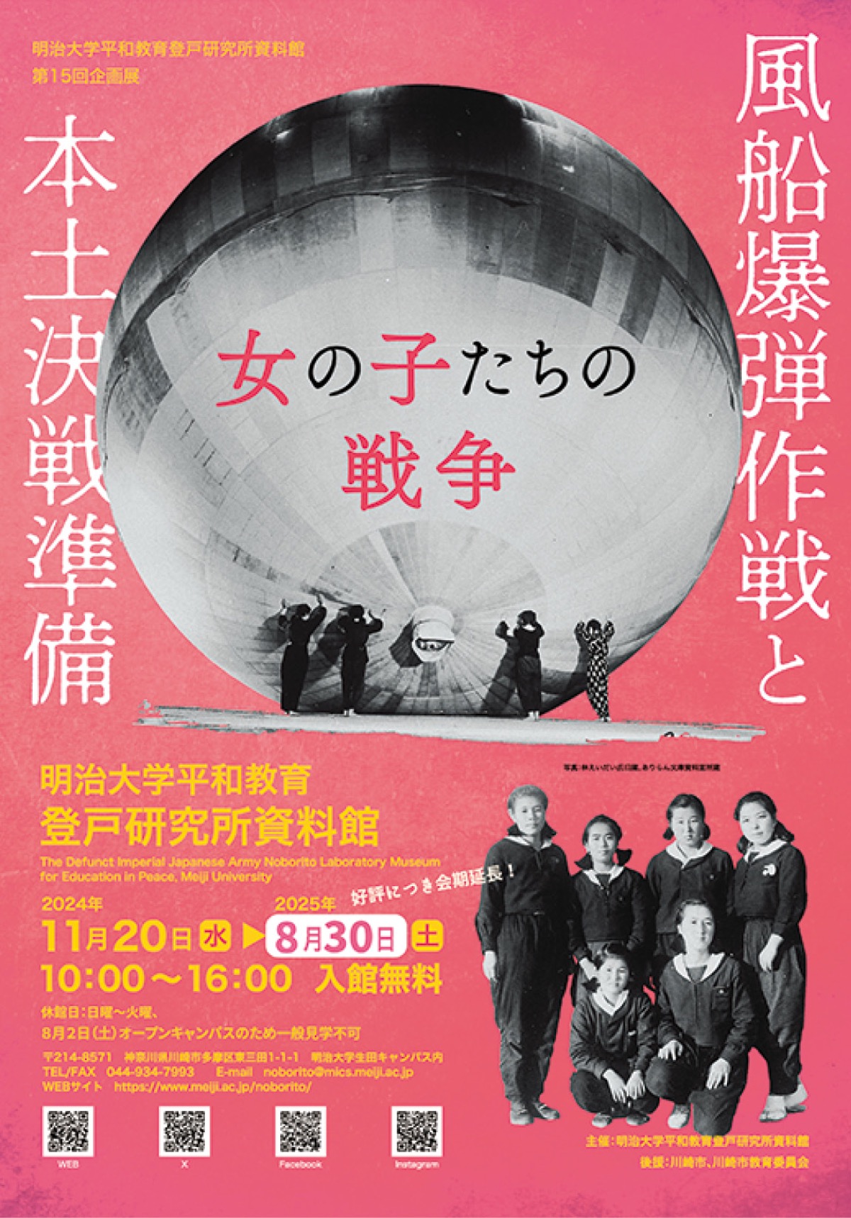 明治大学生田キャンパスにある平和教育登戸研究所資料館で開催中の企画展「風船爆弾作戦と本土決戦準備-女の子たちの戦争-」が好評につき、会期が3カ月延長されることが決まった。5月31日(土)で終了の予定だったが、8月30日(土)までとなった。