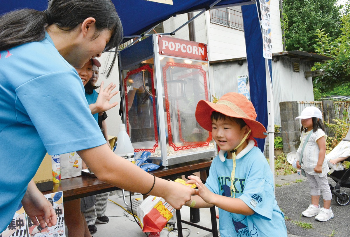 中でも、鹿島田子ども会の子どもたちで組織するバレーボールクラブ・鹿島田エンジェルスは、ポップコーンを販売。近隣の学校に通う小学生たちが自らの手でポップコーンを作り、味付けまで行った。できたてが食べられるとブースには列ができ、パチパチとはね上がるポップコーンを興味津々に見つめる子どもたちでにぎわった。夢見ヶ崎小学校6年の長谷川蒼大さんは「暑かったけど、小さな子たちの笑顔が見られて嬉しかった」と満足げに語った。コンソメ味を食べた渡邊心花(みはな)ちゃんは「できたてのポップコーンがあったかくて美味しかった」と恥ずかしそうに笑った。