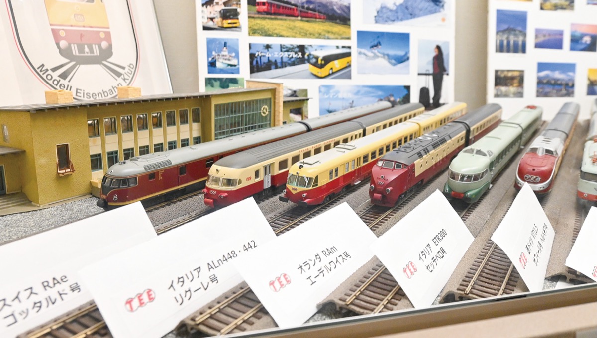 今回、展示されているのは、実物大の87分の1スケールのHOゲージで、ヨーロッパ8カ国の鉄道模型17種類。特徴的なのが、自動車などの旅客輸送に勝ち、かつ旅客の中心だったビジネスマンのために、ヨーロッパ主要都市間を短時間で結ぶ国際列車網として誕生したTEE(トランス ユーロープ エクスプレス)の模型が並んでいること。TEEに参加するためには定員や車両カラーなど複数の条件が必要だったが、車両カラーが異なるというフランス国鉄の珍しい模型が資料と共に展示されている。また、西ドイツ、オランダの航空会社とタイアップした珍しいカラーの模型も並ぶ。