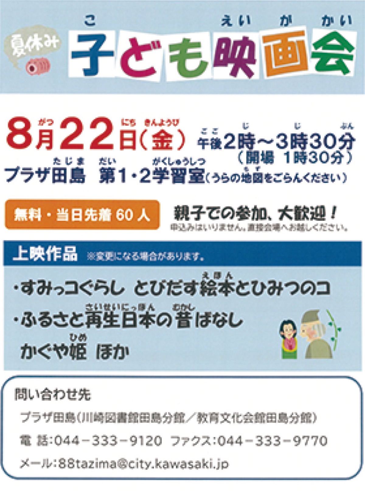 プラザ田島 第1・2学習室(川崎区追分町)で、夏休みを親子で楽しむ「子ども映画会」が、8月22日(金)に開催される。時間は午後2時〜3時半(1時半開場)。