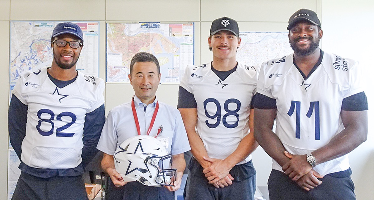 富士通スタジアム川崎(川崎区富士見)を本拠地とする社会人アメリカンフットボールⅩリーグ「オリエンタルバイオシルバースター」の選手とスタッフが8月27日、川崎区役所を表敬訪問=写真=し、今季の活躍を誓った。
