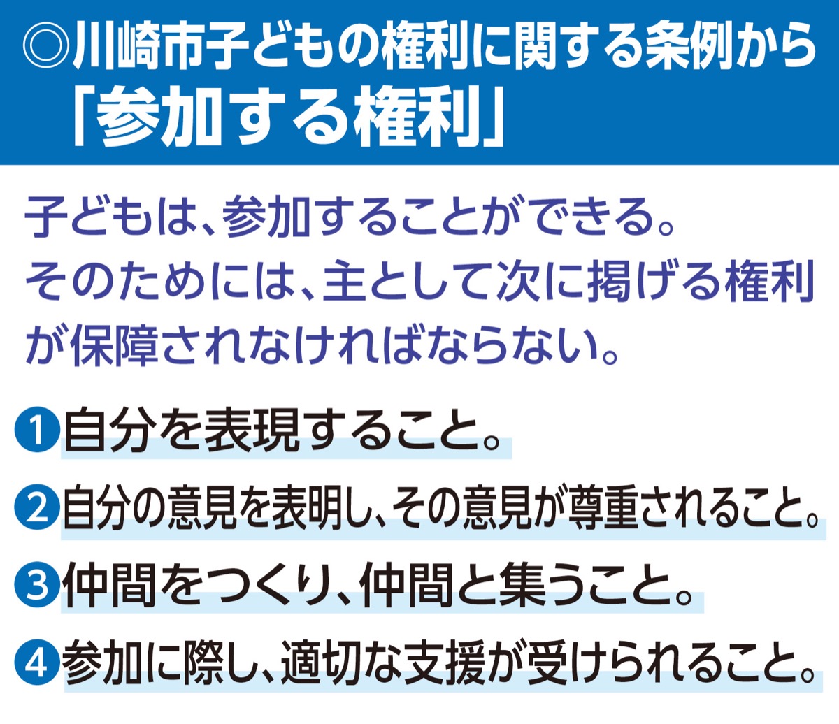 市の子どもの権利条例では、15条「参加する権利」の中で「自分の意見を表明し、その意見が尊重されること」を権利として保障している。