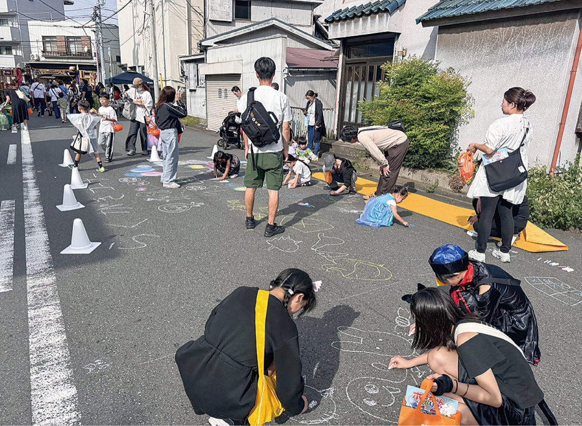 商店街を「トリック・オア・トリート」の合言葉でめぐり、各店舗でお菓子がもらえるスタンプラリーなどが実施されました。フォトスポットには仮装姿の子どもの姿が見られ、道路にチョークで自由に絵を描けるストリートアートやワークショップを楽しむ姿が見られました。