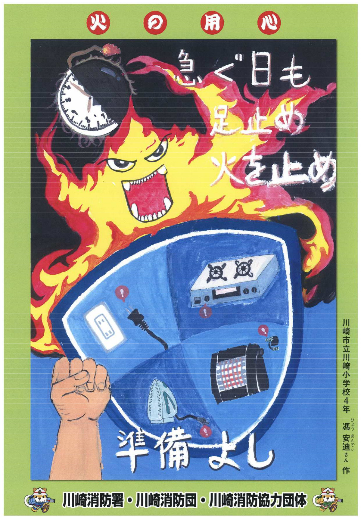 最優秀賞に輝いた同校4年の馮(ひょう)安迪(あんでぃ)さんは「コンロや電気器具などから発生した火災の恐怖を表現するため、火の形や色合いを工夫した」と話した。優秀賞の明立(あだち)真奈さん(4年)は「大事なのはコンロを使った後。火がしっかり消えているか確認していることを表した」と作品を解説した。