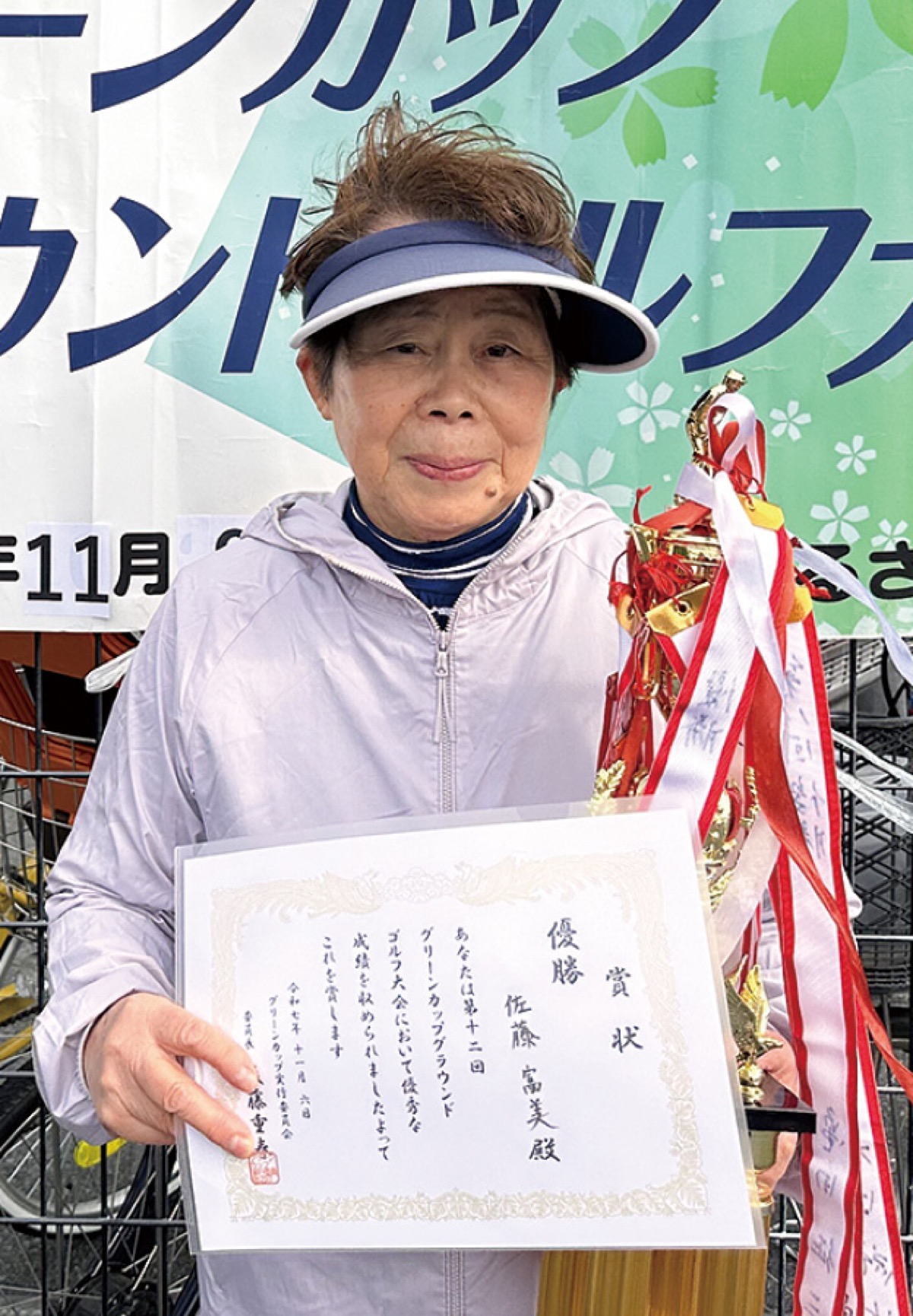 大会は計16ホールを個人戦で競い佐藤富美さんが優勝。佐藤さんは「運もあり、優勝できた。これからのグラウンド・ゴルフの活動も今日の事を忘れずに取り組み来年も優勝目指して頑張りたい」と声を弾ませた。