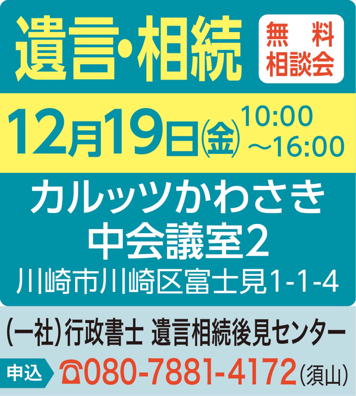 (一社)行政書士遺言相続後見センターが12月19日(金)、午前10時から午後4時、カルッツかわさき 中会議室2(川崎区富士見)で、第45回無料相談会を開催する。予約優先、当日参加可。