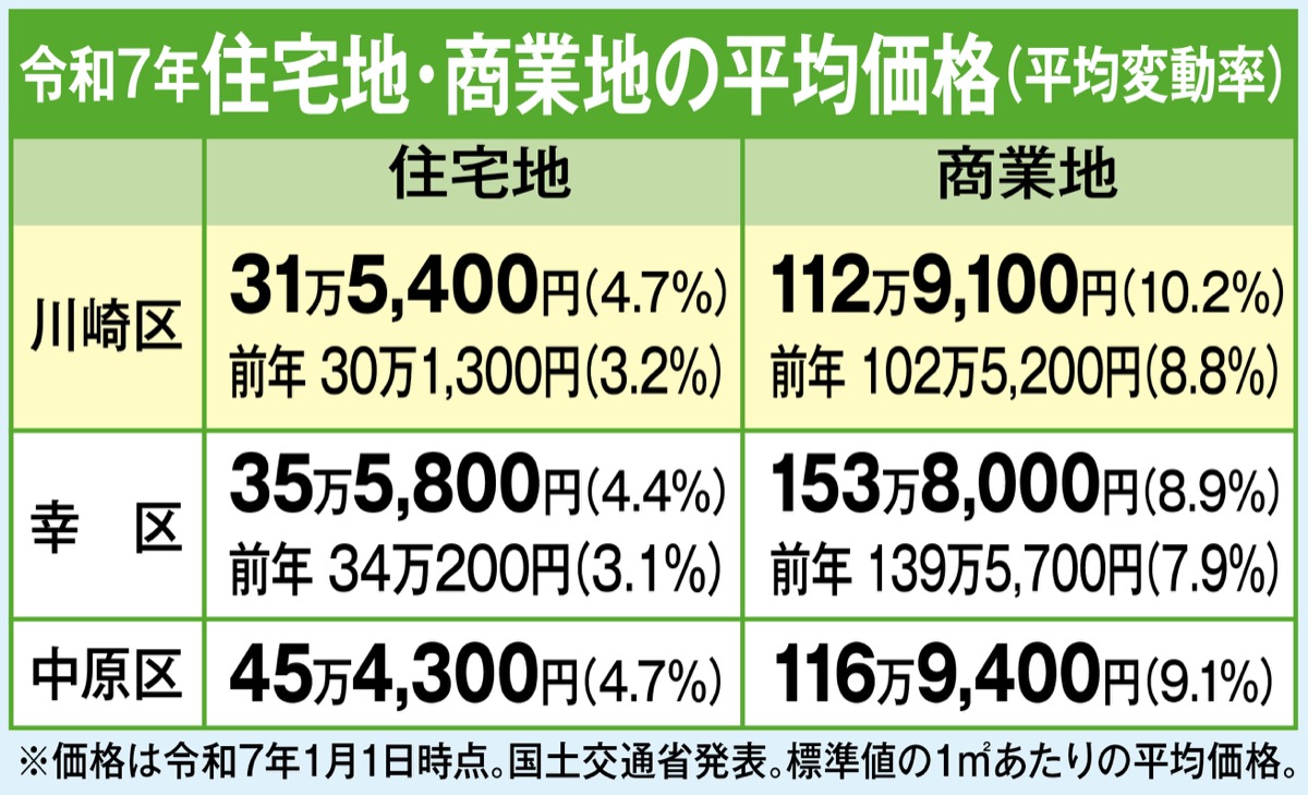 国交省が昨年3月に公表した令和7年の公示地価で、川崎市は全ての区で上昇し、平均変動率は4・4%と上昇率が拡大。川崎区は4・7%、幸区は4・4%で、交通利便性の高い住宅地を中心に需要が堅調で、起伏のある地勢やバス圏でも地価上昇が見られた。商業地は、川崎駅徒歩圏で上層階を共同住宅として利用可能な地域で強い上昇傾向となった。
