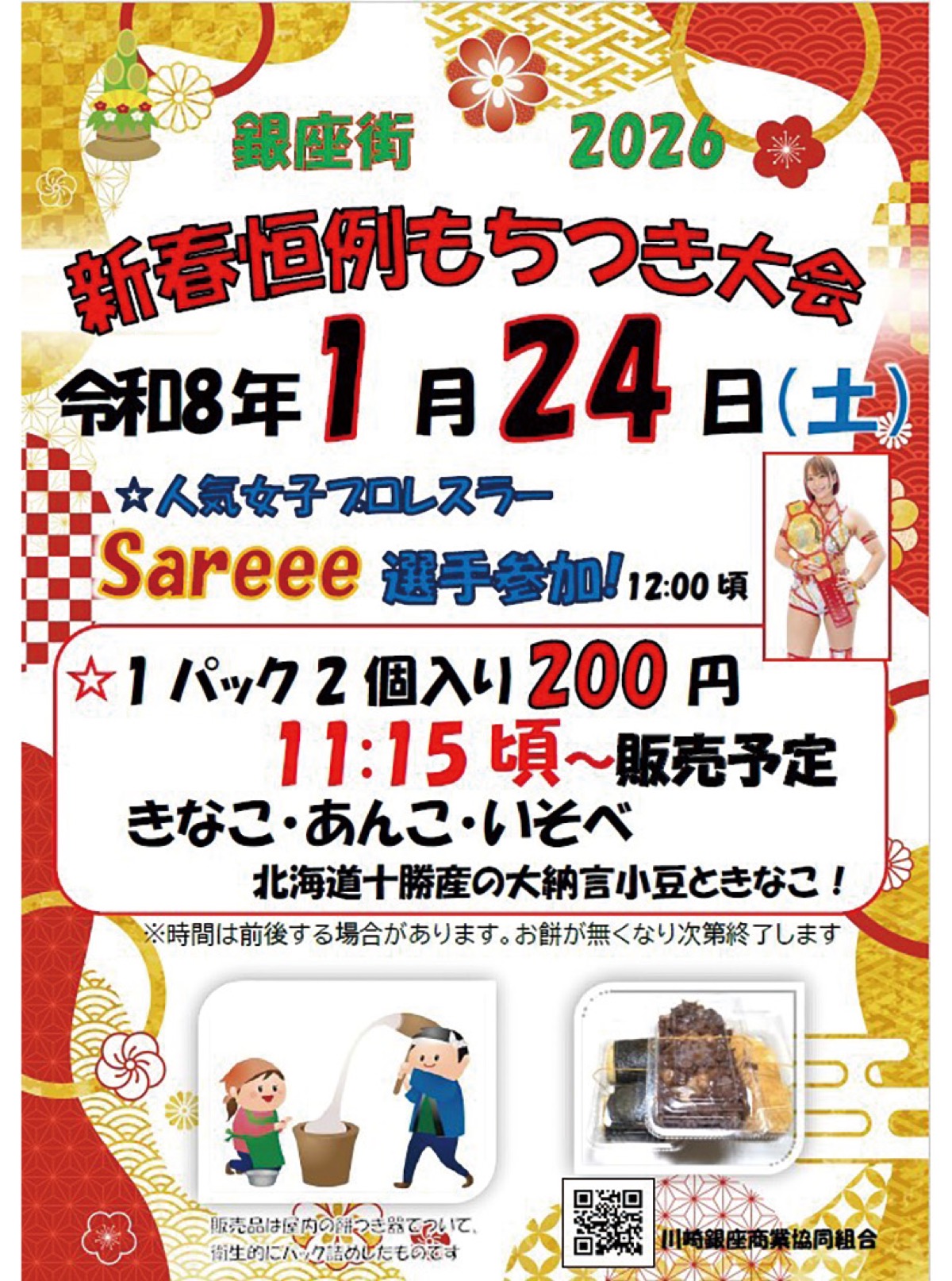 京急川崎駅前の商店街「川崎銀座街」(小林一三理事長)で1月24日(土)、新春餅つき大会が行われる。正午頃には、人気女子プロレスラーのSareee(サリー)選手が出演予定。