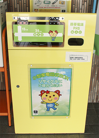 回収品目は携帯電話のほかビデオカメラ、ICレコーダー、電子辞書、ゲーム機など。区役所に設置されている回収ボックスの投入口(30cm×15cm)に入る家電製品が対象となる。