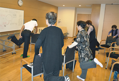 当日は、同町内に住む男女20人が参加。トレーナーの指導の下、椅子などを使った運動で汗を流した。