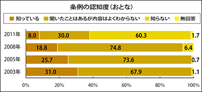 近年の児童相談所への虐待相談・通告件数をみると、01年度の435件から12年度は1237件と3倍近く増加している。また調査によると、条例を「知っている」と回答した大人は03年の31・0%から08年は18・8%に低下している。