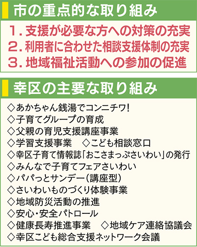 地域性に合わせて各区の計画も策定した。幸区では、「『誰もが生涯にわたって、安心して、いきいきと暮らせる幸区』の実現」を理念に、基本目標には【1】地域や個人が抱える悩みを地域のさまざまな人の力で共に考え、解決に向け取り組んでいく「誰もが安心して生活できる住みやすいまちづくり」【2】国籍、障害、世代等の特色や文化の違いを認め合い、受け入れあうノーマライゼーション社会の実現を目指す「国籍・障害・世代等を超えたつながりのある健康で豊かなまちづくり」【3】地域資源を活用しながら、区民同士のネットワークを形成し、地域の福祉活動の活性化を目指す「区民の参加と協働による活力あるまちづくり」――3項目を掲げた。