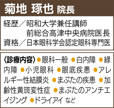 菊地院長は、総合高津中央病院の眼科医長を務め、白内障や加齢性黄斑変性症はもちろん、多くの症例の手術を施行した実績をもつ。「患者さんを第一に考え、常に温かくお迎えし、目だけでなく心も癒されたと感じて頂けるクリニックを作りたい」との思いで鹿島田の地に同院を開いた。