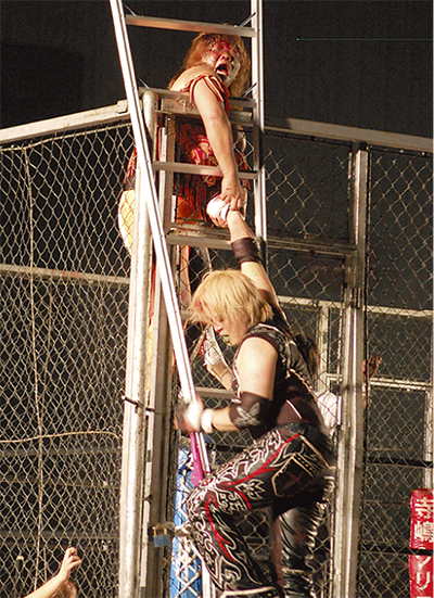 ワールド女子プロレス・ディアナ(殿町)が4月29日、団体設立3周年記念大会を川崎市体育館で開催した。メーンイベントでは、同団体代表の井上京子選手率いる正規軍と、堀田祐美子選手率いる暴走軍が2対2の「金網デスマッチ」を行った。試合は反則、ギブアップなしの時間無制限で、どちらかのチームが2人とも場外にエスケープできて勝利となるルール。
