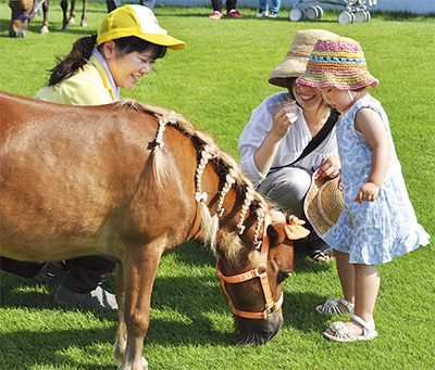 これは同組合が夏休み中の子どもたちに向けたファンサービスの一環として開いたもの。子どもたちでも怖がらずに、アメリカンミニチュアホースやポニーといった小さい馬と楽しんでもらおうと、記念撮影やエサやりが体験できるように企画した。