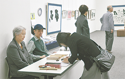 今回は同時に市内在住の書道家、瀬崎竜彦さん(38)の個展「心画展」も開かれた。言葉を話さない自閉症の瀬崎さんは、6歳から書を始め、心の表現を書で表してきた。個展は6日間開かれ、大震災のあと東北の人々の力や、勇気を届けたいと思い書をしたためた作品を展示した。