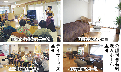 開設以来のベテランスタッフが多く、利用者の家族からの信頼度も高い同施設。有老は共用スペースがゆったりと配置され高級感のあるしつらえが特徴。居室も19・10〜23・50平方メートルで窓が大きいため、非常に室内が広く感じる。日中看護師常勤、提携医療機関の24時間緊急対応OK。食事は毎食、和食か洋食か選べ、月3回は食イベント「美食まつり」も。体験宿泊8640円〜(3食込)も可。