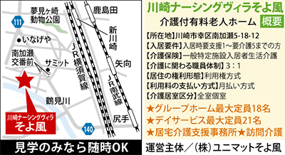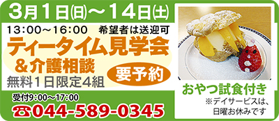 「川崎ナーシングヴィラそよ風」は、介護付き有料老人ホーム、グループホーム、デイサービスの複合施設。この3つを一度に見学できる、ティータイム試食付無料見学会&介護相談会を3月1日(日)〜14日(土)に開催。前回の見学会では「まずデイサービスを利用し、その後入居も考えたい」などのご相談もあったとのこと。希望者は送迎可。