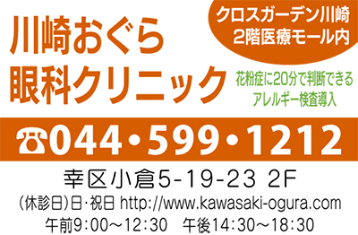 近年、子どもの近視や弱視が増えているという。小児専門の視能訓練士が揃う『川崎おぐら眼科クリニック』では、この時季、学校検診の結果を踏まえて再検査を希望する小・中学生の姿が目立っている。西岡院長は「原因ははっきりと分かっておりませんが、スマホやタブレットの使い過ぎ、就寝時間の短縮、栄養の偏りなどによって近視・弱視になる子どもが増えています。正確な検査をし、早期の対策をすることが重要になります」と話している。同院では専門の訓練士が、視野や眼圧、眼球運動などいくつもの項目を丁寧に検査し、目の異常を見つけ出してくれる。また、3歳児検診を導入し早い段階から症状を発見できるように努めている。「これからの時期はプール等で感染する『はやり目』にも注意が必要です。目やにやかゆみが気になったら専門医を受診するように」と西岡院長。