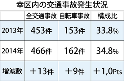 幸区内では、全体の事故発生件数は466件と13年より13件増加、自転車事故も、9件増えて162件で、県平均(22・7%)より13ポイント高い、34・8%で、12年連続の指定となった。県下では川崎区(37・5%)、中原区(34・9%)に次いで3番目。