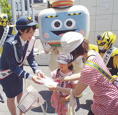 また、この日は女子バレーボールチーム「NECレッドロケッツ」の近江あかり副キャプテンが一日警察署長を委嘱された。近江さんは、痴漢撃退シールを道行く女性らに配布しながら被害の防止を呼び掛けた。 近江さんは「バレーの試合では瞬時の判断と勇気が大切。万が一被害に遭ったら、勇気を出して声をあげて」と話していた。
