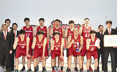 キャプテンの篠山竜青選手、プレーオフMVPの辻直人選手は日本代表合宿に参加するため、報告会は欠席した。9月に発足する男子バスケのBリーグは、これまで国内に2リーグあったNBLとbjリーグが統合したもの。3部制になっており、東芝は1部中地区への参入が決まっている。