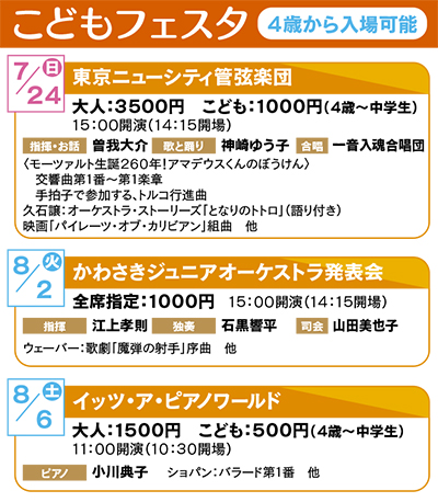 いよいよミューザ川崎シンフォニーホールで23日(土)からスタートする「フェスタサマーミューザ2016」。様々な公演が行われる中、4歳以上の子どもから入場が可能な「こどもフェスタ(3公演)」が開催される。本物の音楽に触れ、夏休みの思い出になる最適なコンサートだ。チケットの取り扱い・問合わせは同ホール(【電話】044・520・0200/10時〜18時)。