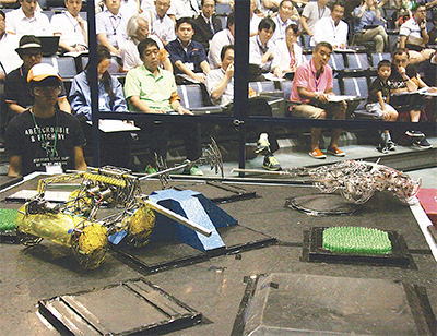 同大会では障害物が置かれた190センチ四方のリング上で、ラジコン型ロボットが対戦、相手を倒すか一定時間押さえるなどすると一本となる。