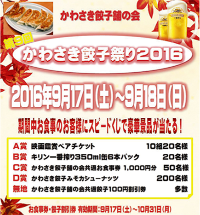 川崎の新たな名物として餃子をアピールし地域の活性化に役立てようと活動しているかわさき餃子舗の会(鬼塚保会長)は9月17日(土)、18日(日)の2日間で「かわさき餃子祭り」=写真=を開催。期間中に23の加盟店舗で餃子などの中華料理を食事するとスピードくじで映画鑑賞ペアチケットや缶ビール6本パック、餃子舗の会共通の食事券・割引券(有効期限10月31日)が当たる。