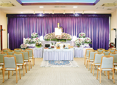 ホールは全館使用のほか、家族葬などに最適な半館での使用もできる。なかはらや倶楽部会員割引有。家族葬では広々としたホールをパーテーションで仕切り、程よい空間で故人を送る演出を提供している。