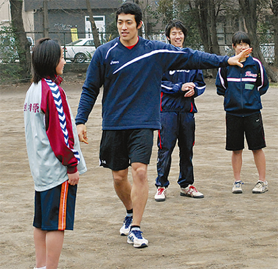同校の校風である「文武両道」を促進する目的で実現した今回の企画。当日は、ハンドボールの銘苅淳(あつし)選手(トヨタ車体株式会社所属)が同校のハンドボール部を訪れ、独自に編み出した練習方法を伝授した。中にはゲーム感覚で筋肉や反射神経が鍛えられるものもあり、生徒たちは終始笑顔で練習に取り組んだ。銘苅選手は、「どの練習も勝つためにやっているんだ」と呼びかけ、練習の大切さを伝えていた。