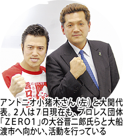 現地入りしたのは、大関代表ら同団体の7人とお笑いタレントのアントニオ小猪木さん(西口プロレス所属)。親しい仲であるアントニオ小猪木さんに大関代表が声をかけると、快諾。一緒に活動することになった。