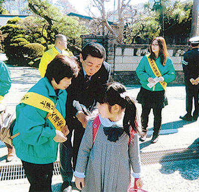 相模原警察署、相模原交通安全協会、上溝地区交通安全母の会などは5日、上溝小学校、上溝南小学校の入学式に合わせ、校門付近で母の会のメンバーが作った折鶴付きのお守りと鉛筆などを配って、交通ルール遵守を呼びかけた。