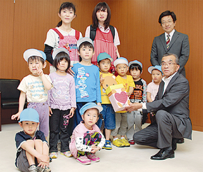 当日は西橋本みたけ保育園の園児9人も市役所を訪れ、子どもたちのお小遣いと見られる5円や10円が多く入った募金箱を贈呈。子どもたちは「頑張ってください」と、被災地へのメッセージを読みあげていた。