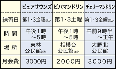 イタリアの楽器であるマンドリンは習得が比較的容易といわれる楽器。同サークルでは基礎練習のほか、身近な曲にもチャレンジし、演奏力を高めていく。同時にマンドリンの特徴でもあるピッキングやトレモロの美しい音色も楽しめる。指導は国立音楽大卒でヤマハ音楽普及振興会ピアノ講師の経験もある代表の黒川好美さん。マンドリンの貸し出し(有料)もあるので、経験者はもちろん、初心者、未経験者でもOK。体験については、問い合わせを。