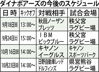 ダイナボアーズは序盤から得点を重ねるが、前半の終わりに栗田工業にトライを許すなど、15―10で試合を折りかえした。後半は2つのトライとペナルティーキックでダメ押し。相手に得点を許さず勝ち点5を手にした。