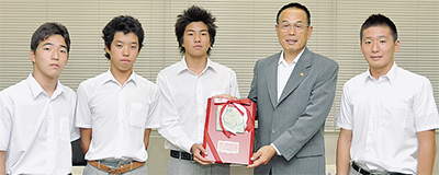 全国中学校体育大会の報告会が12日に行われ、水泳の400mリレーで2位になった大野北中学校男子チームと、柔道の個人戦で優勝を果たした東海大学付属相模高校中等部の浅野未来選手が加山俊夫市長に大会成績を報告した。