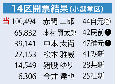 第46回衆議院選挙の投開票が16日に行われ、神奈川14区(相模原市中央区、南区と緑区の一部)は、自民党公認候補の赤間二郎氏(44)が当選した(小選挙区選出)。得票数は100,494。