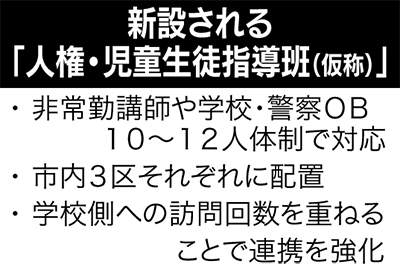 新しい仕組みでは、非常勤講師や学校・警察OBを指導班として市内3区にそれぞれ配置。10〜12人体制を敷くことで各学校と密に連携を取り、回数を重ねて訪問するなど、事態が深刻化する前に計画的に対策を講じていく。