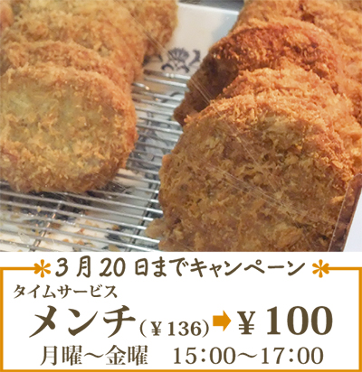 同店の上質な肉で作った通常136円のメンチカツが、期間中は平日の午後3時から5時まで100円となる。特価で食べられる機会をお見逃し無く。