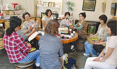 家族など、身近な人の介護をしている9人が参加。日頃の介護における悩みや体験などを話し合ったほか、地域の民生委員による経験談や本の紹介などにも熱心に耳を傾けていた。「おしゃべりの会」では介護の話以外にも、同ギャラリーに並ぶ風景画を鑑賞したり、コーヒーを飲んで交流を楽しんでいる。